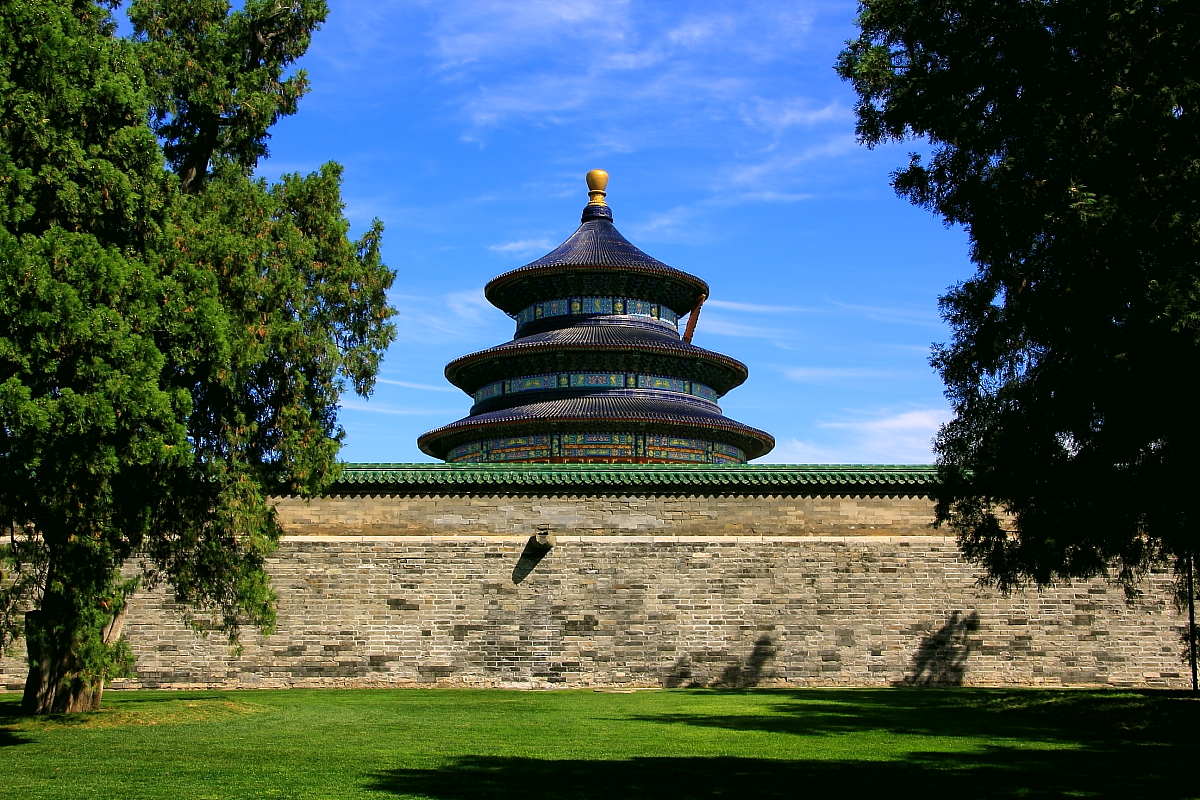 The Temple of Heaven is one of several worship sites in the capital where the emperors offered sacrifices. Its location in the city derives from the notion that yang,the mal vital principle,is located n the south;and as Heaven is yang,it should be worshipped in the southern suburbs of the capital.